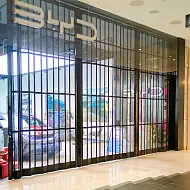 - Shutters fold neatly into a side pocket or recess, leaving entrances fully open and accessible during trading hours