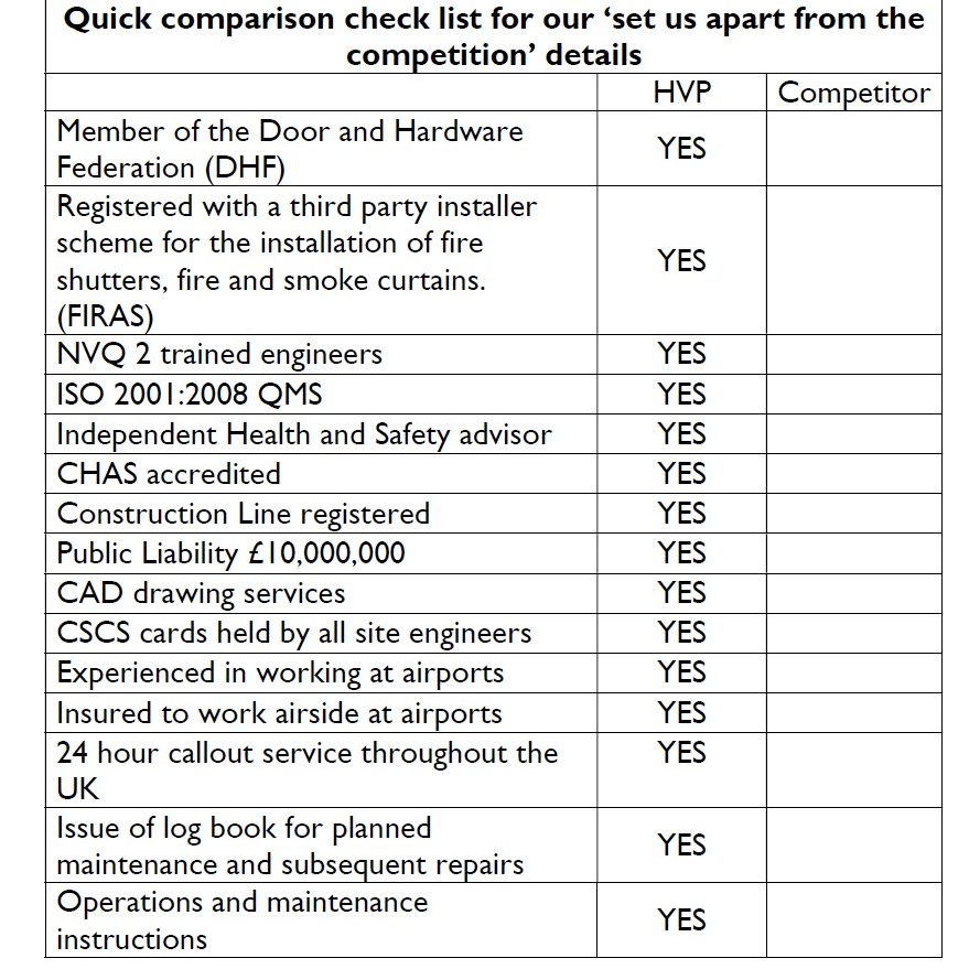 Often the question is asked about a company’s USPs. It’s considered to be one of those trendy marketing expressions which I always have to stop and think about, not because HVP doesn’t have any USPs, it is just that I always have to remember that it stands for ‘Unique Selling Points’. Easier just to ask, “What sets you apart from your competition?” Within the shutter industry we all sell similar products; aluminium or steel rolling shutters for security, fire shutters, doors and sliding shutters. Anyone can set up a factory or workshop and manufacture the above products so perhaps the most important question should be: “Who should I buy from?”